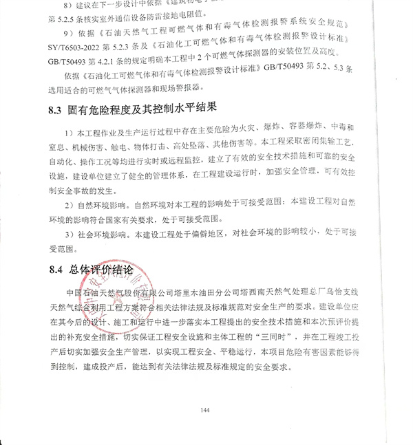 中國石油天然氣股份有限公司塔里木油田分公司塔西南天然氣處理總廠烏恰支線天然氣綜合利用工程方案符合相關(guān)法律法規(guī)及標(biāo)準(zhǔn)規(guī)范對安全生產(chǎn)的要求。建設(shè)單位應(yīng)在其今后的設(shè)計(jì)、施工和運(yùn)行中進(jìn)一步落實(shí)本工程提出的安全技術(shù)措施和本次預(yù)評價(jià)提出的補(bǔ)充安全措施,切實(shí)保證工程安全設(shè)施和主體工程的“三同時”,并在工程竣工投產(chǎn)后切實(shí)加強(qiáng)安全生產(chǎn)管理,以實(shí)現(xiàn)工程安全、平穩(wěn)運(yùn)行,本項(xiàng)目危險(xiǎn)有害因素能夠得到控制,建成投產(chǎn)后,能達(dá)到有關(guān)法律法規(guī)及標(biāo)準(zhǔn)規(guī)定的安全要求。 |