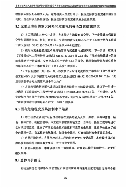 吐哈油田分公司鄯善采油管理區(qū)石錢區(qū)塊探評井轉(zhuǎn)采地面配套項目方案符合相關(guān)法律、法規(guī)及標(biāo)準(zhǔn)規(guī)范對安全生產(chǎn)的要求。建設(shè)單位應(yīng)在其今后的設(shè)計、施工和運行中進(jìn)一步落實本工程方案提出的安全技術(shù)措施和本次預(yù)評價提出的補充安全措施,確實保證工程安全設(shè)施和主體工程的“三同時”,并在工程竣工投產(chǎn)后切實加強安全生產(chǎn)管理,以實現(xiàn)工程安全、平穩(wěn)運行,本項目危險有害因素能夠得到控制,建成投產(chǎn)后,能達(dá)到有關(guān)法律、法規(guī)及標(biāo)準(zhǔn)規(guī)定的安全要求。 |