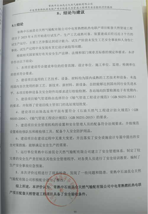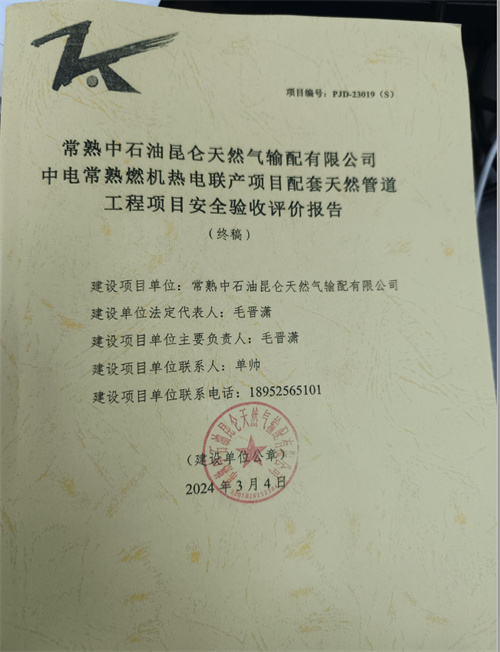 常熟中石油昆侖天然氣輸配有限公司中電常熟燃機熱電聯(lián)產(chǎn)項目配套天然管道工程項目安全設施竣工驗收評價報告 |