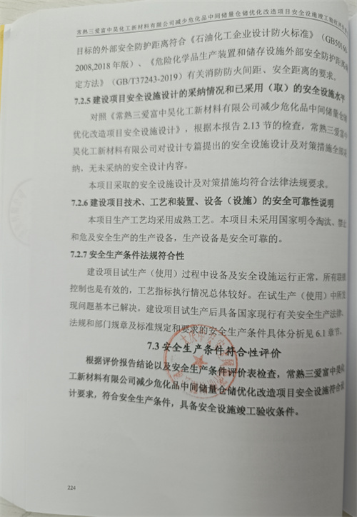 常熟三愛(ài)富中昊化工新材料有限公司減少?;分虚g儲(chǔ)量倉(cāng)儲(chǔ)優(yōu)化改造項(xiàng)目安全設(shè)施符合設(shè)計(jì)要求,符合安全生產(chǎn)條件,具備安全設(shè)施竣工驗(yàn)收條件 |