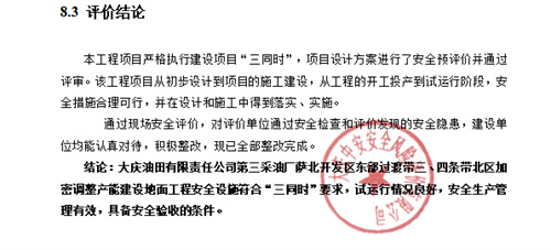 本工程項(xiàng)目嚴(yán)格執(zhí)行建設(shè)項(xiàng)目“三同時(shí)”,項(xiàng)目設(shè)計(jì)方案進(jìn)行了安全預(yù)評(píng)價(jià)并通過評(píng)審。該工程項(xiàng)目從初步設(shè)計(jì)到項(xiàng)目的施工建設(shè),從工程的開工投產(chǎn)到試運(yùn)行階段,安全措施合理可行,并在設(shè)計(jì)和施工中得到落實(shí)、實(shí)施。 通過現(xiàn)場(chǎng)安全評(píng)價(jià),對(duì)評(píng)價(jià)單位通過安全檢查和評(píng)價(jià)發(fā)現(xiàn)的安全隱患,建設(shè)單位均能認(rèn)真對(duì)待,積極整改,現(xiàn)已全部整改完成。 結(jié)論:大慶油田有限責(zé)任公司第三采油廠薩北開發(fā)區(qū)東部過渡帶三、四條帶北區(qū)加密調(diào)整產(chǎn)能建設(shè)地面工程安全設(shè)施符合“三同時(shí)”要求,試運(yùn)行情況良好,安全生產(chǎn)管理有效,具備安全驗(yàn)收的條件。 |