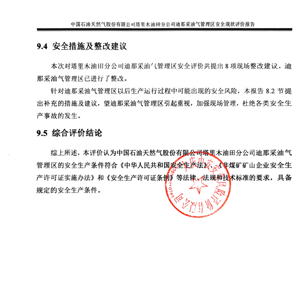 中國石油天然氣股份有限公司塔里木油田分公司迪那采油氣管理區(qū)安全現(xiàn)狀評價報告