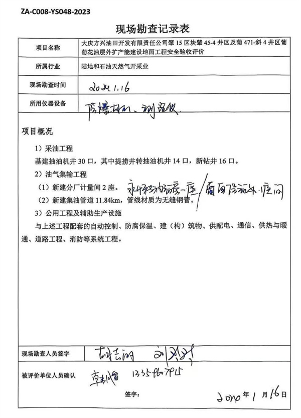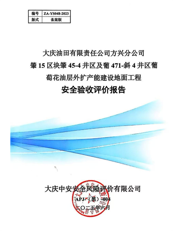 大慶油田有限責(zé)任公司方興分公司肇15區(qū)塊肇45-4井區(qū)及葡471-斜4井區(qū)葡萄花油層外擴(kuò)產(chǎn)能建設(shè)地面工程安全驗(yàn)收評(píng)價(jià) |