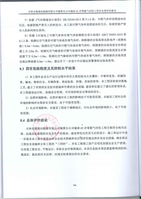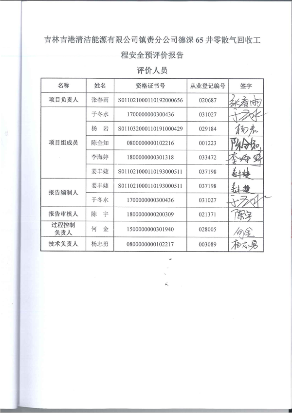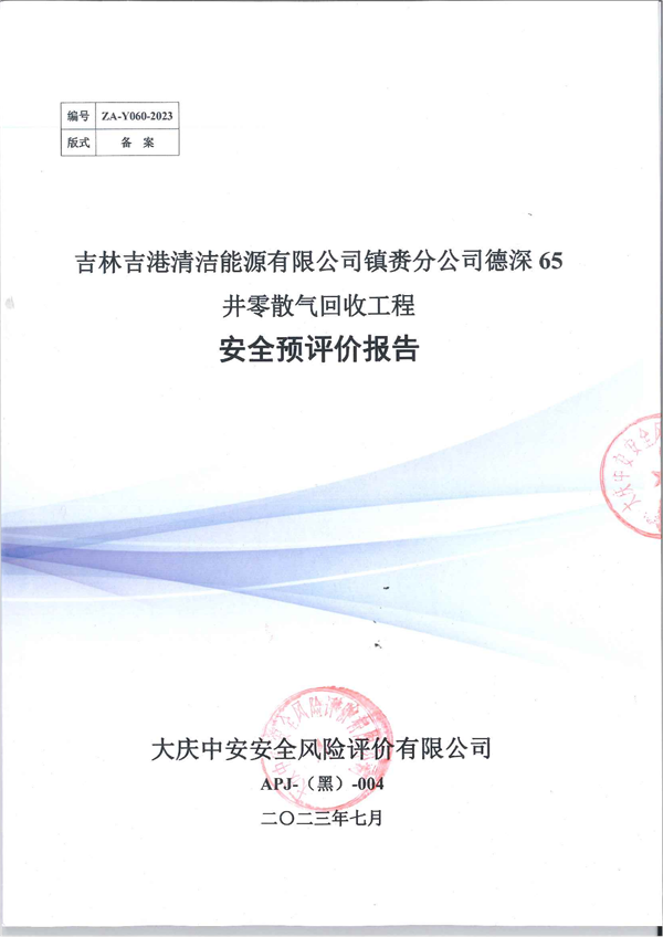吉林吉港清潔能源有限公司鎮(zhèn)賚分公司德深65井零散氣回收工程安全預(yù)評(píng)價(jià)報(bào)告 |