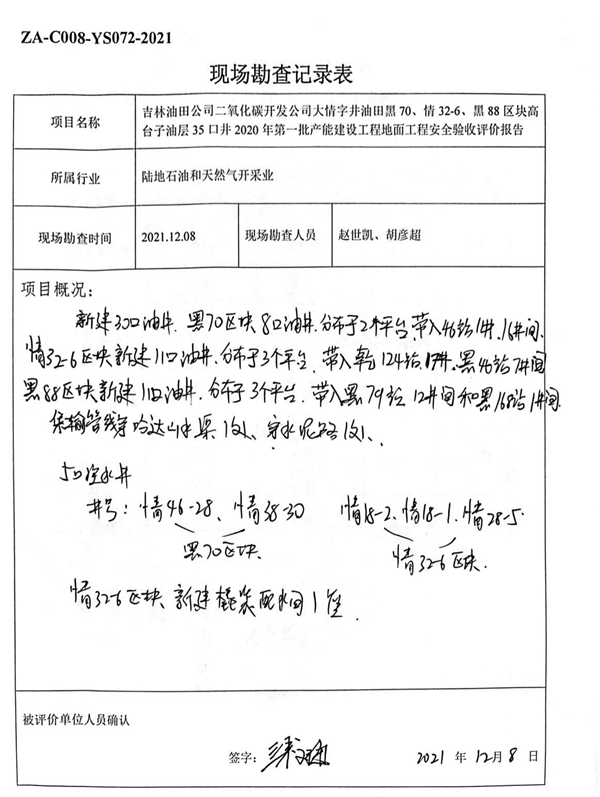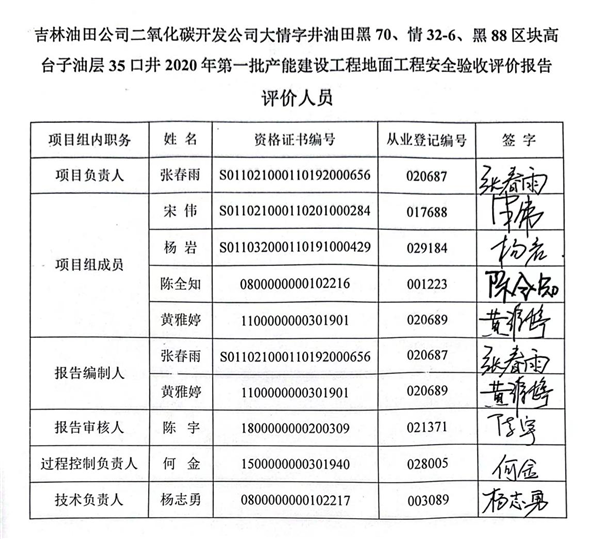 吉林油田公司二氧化碳開發(fā)公司大情字井油田黑7032-6、黑88區(qū)塊高臺子油層35口井2020年第一批產(chǎn)能建設(shè)工程地面工程安全驗收評價報告