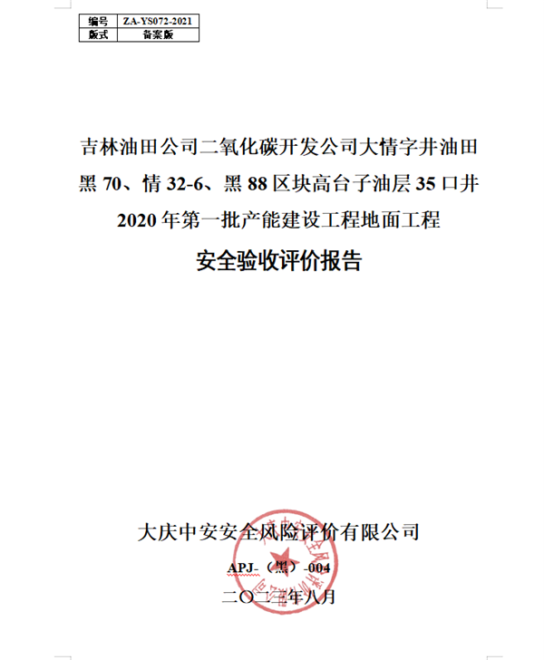 吉林油田公司二氧化碳開發(fā)公司大情字井油田黑70、情32-6、黑88區(qū)塊高臺子油層35口井2020年第一批產(chǎn)能建設(shè)工程地面工程安全驗收評價報告