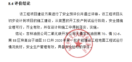 結(jié)論:林油田公司二氧化碳開發(fā)公司大情字井油田黑7032-6、黑88區(qū)塊高臺子油層35口井2020年第一批產(chǎn)能建設(shè)工程地面工程試運行情況良好,安全生產(chǎn)管理有效,具備安全驗收的條件。