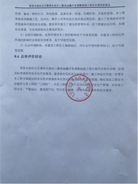 塔里木油田公司桑塔木油田三疊系油藏開發(fā)調(diào)整地面工程方案符合相關法律、法規(guī)及標準規(guī)范對安全生產(chǎn)的要求。建設單位應在其今后的設計、施工和運行中進一步落實本工程方案提出的安全技術措施和本次預評價提出的補充安全措施,確實保證工程安全設施和主體工程的“三同時”,并在工程竣工投產(chǎn)后切實加強安全生產(chǎn)管理,以實現(xiàn)工程安全、平穩(wěn)運行,建成投產(chǎn)后,符合有關法律、法規(guī)及標準規(guī)定的安全要求。