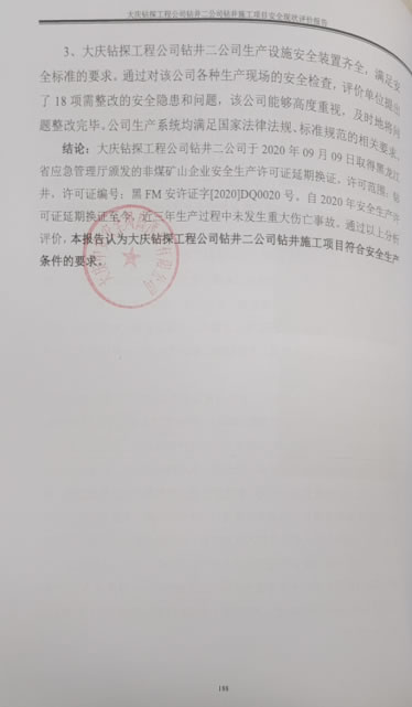 大慶鉆探工程公司鉆井二公司于2020年09月09日取得黑龍江省應(yīng)急管理廳頒發(fā)的非煤礦山企業(yè)安全生產(chǎn)許可證延期換證,許可范圍:鉆井,許可證編號(hào):黑FM安許證字[2020]DQ0020號(hào)。自2020年安全生產(chǎn)許可證延期換證至今,近三年生產(chǎn)過程中未發(fā)生重大傷亡事故。通過以上分析評(píng)價(jià),本報(bào)告認(rèn)為大慶鉆探工程公司鉆井二公司鉆井施工項(xiàng)目符合安全生產(chǎn)條件的要求。 |