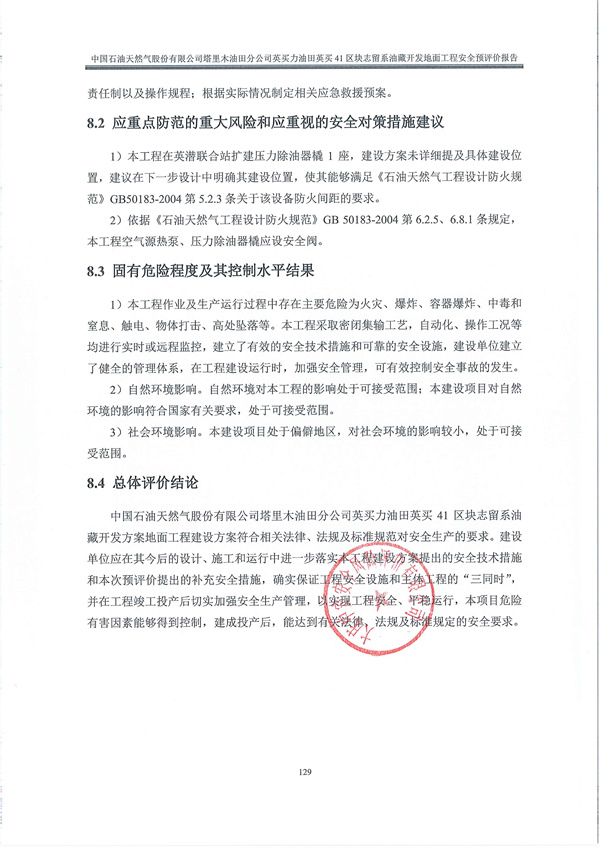 中國石油天然氣股份有限公司塔里木油田分公司英買力油田英買41區(qū)塊志留系油藏開發(fā)方案地面工程建設(shè)方案符合相關(guān)法律、法規(guī)及標準規(guī)范對安全生產(chǎn)的要求。建設(shè)單位應(yīng)在其今后的設(shè)計、施工和運行中進一步落實本工程建設(shè)方案提出的安全技術(shù)措施和本次預(yù)評價提出的補充安全措施,確實保證工程安全設(shè)施和主體工程的“三同時”,并在工程竣工投產(chǎn)后切實加強安全生產(chǎn)管理,以實現(xiàn)工程安全、平穩(wěn)運行,本項目危險有害因素能夠得到控制,建成投產(chǎn)后,能達到有關(guān)法律、法規(guī)及標準規(guī)定的安全要求。 |