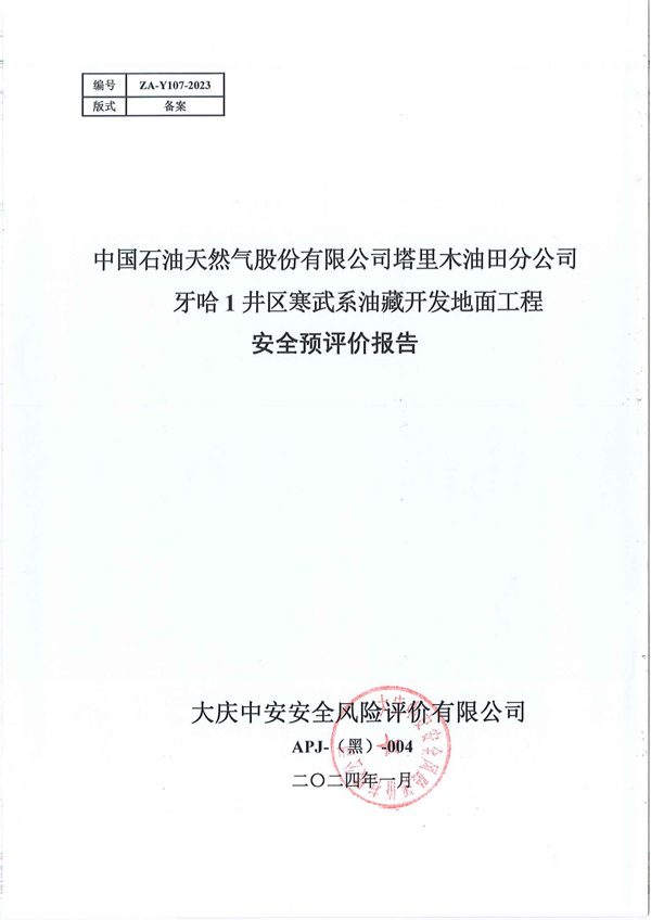中國(guó)石油天然氣股份有限公司塔里木油田分公司牙哈1井區(qū)寒武系油藏開(kāi)發(fā)地面工程安全預(yù)評(píng)價(jià)報(bào)告