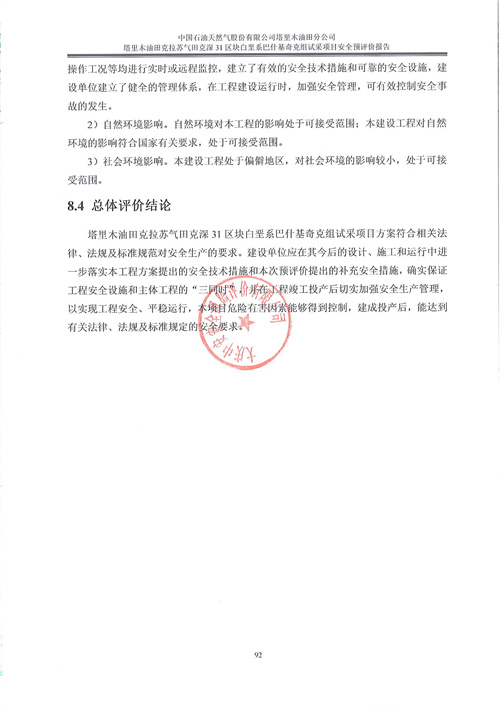 中國石油天然氣股份有限公司塔里木油田克拉蘇氣田克深31區(qū)塊白堊系巴什基奇克組試采項(xiàng)目安全預(yù)評價 |