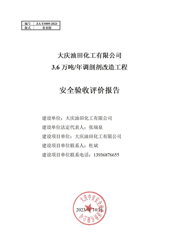 大慶油田化工有限公司3.6萬噸/年調(diào)剖劑改造工程安全驗收評價