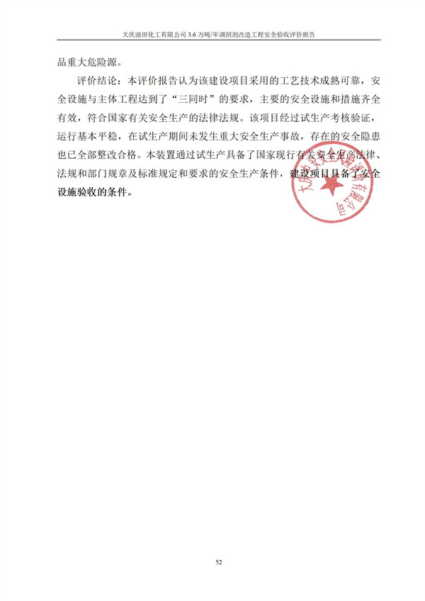 本評價報告認(rèn)為該建設(shè)項目采用的工藝技術(shù)成熟可靠,安全設(shè)施與主體工程達(dá)到了“三同時”的要求,主要的安全設(shè)施和措施齊全有效,符合國家有關(guān)安全生產(chǎn)的法律法規(guī)。該項目經(jīng)過試生產(chǎn)考核驗證,運行基本平穩(wěn),在試生產(chǎn)期間未發(fā)生重大安全生產(chǎn)事故,存在的安全隱患也已全部整改合格。本裝置通過試生產(chǎn)具備了國家現(xiàn)行有關(guān)安全生產(chǎn)法律、法規(guī)和部門規(guī)章及標(biāo)準(zhǔn)規(guī)定和要求的安全生產(chǎn)條件,建設(shè)項目具備了安全設(shè)施驗收的條件。